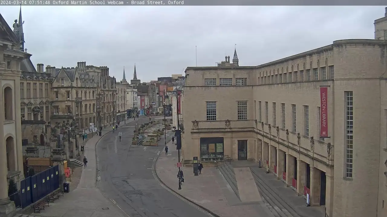 This live streaming webcam in central Oxford, England, is located at Oxford Martin School, a research hub founded in 2005 by the University of Oxford to increase the students’ resources and stimulate their research capacity. Also belonging to this university is Clarendon Building, whose early 18th-century neoclassical facade is still visible on the left-hand side of the image, as well as Weston Library (right-hand side), on the corner of Broad Street and Parks Road.