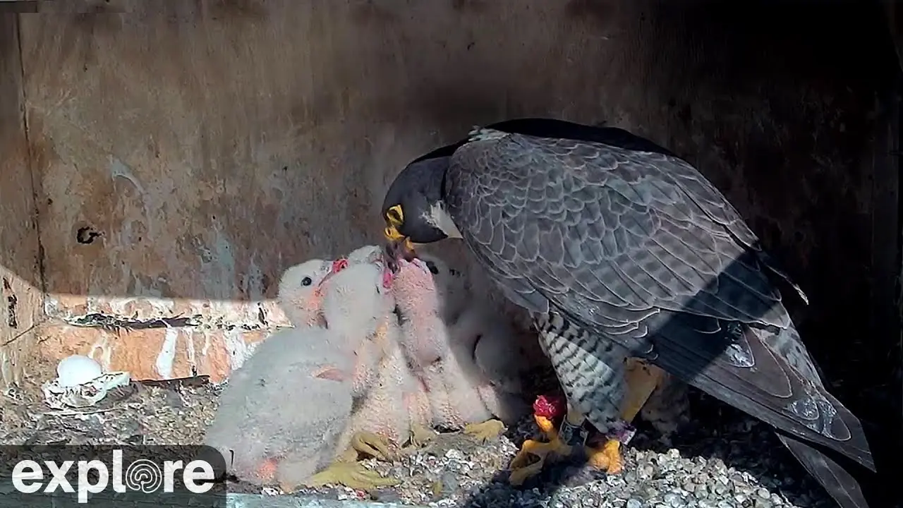 This live falcon cam sits on a cliff face near La Crescent, Minnesota, overlooking Lock & Dam #7 on the Mississippi River. The cam shows the perspective of a peregrine falcon family, known as the Great Spirit Bluff falcons, nesting here on the cliff.