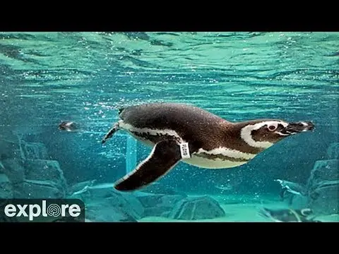 Check out this underwater view of Magellanic penguins swimming and diving together. The underwater penguin exhibit at the Aquarium of the Pacific features Magellanic penguins, some of which were rescued from Brazil where they were stranded outside their native habitat. Viewers can identify the penguins by the color-coded tag on their wings and learn about their personalities by visiting the Penguin Guide.